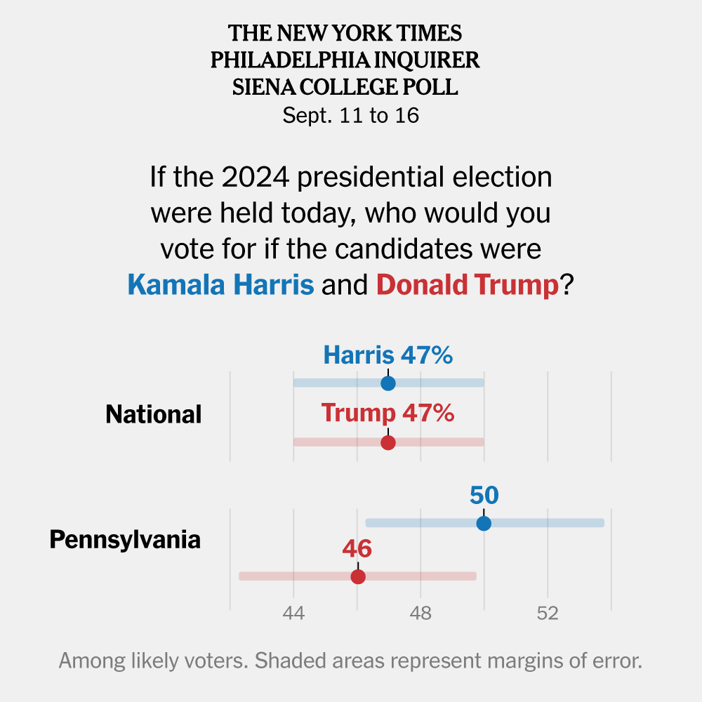 Kamala Harris holds an edge over Donald J. Trump in the battleground state of Pennsylvania. But new surveys found that the race remains a tossup nationally.