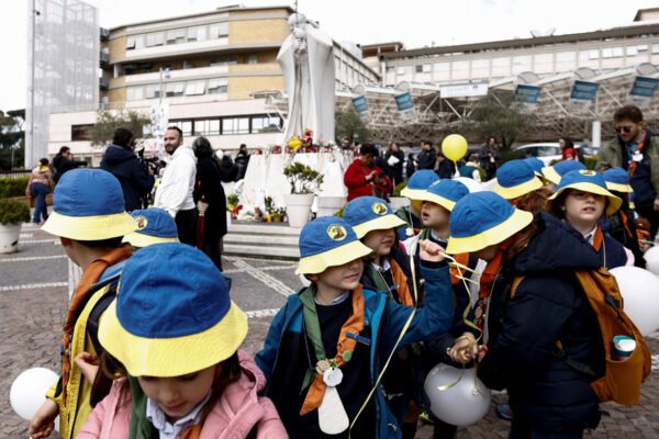 Dozens of young people gathered under the pontiff’s windows at the Gemelli hospital to offer wishes for a quick recovery.